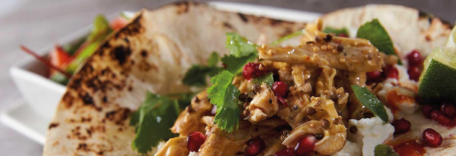 Delicious mango and lime chicken is tossed with harissa, mint, pomegranate and plenty more. Then, it’s all served to you in a delicious, flamed-grilled open tortilla so that you can wrap it up, your way.